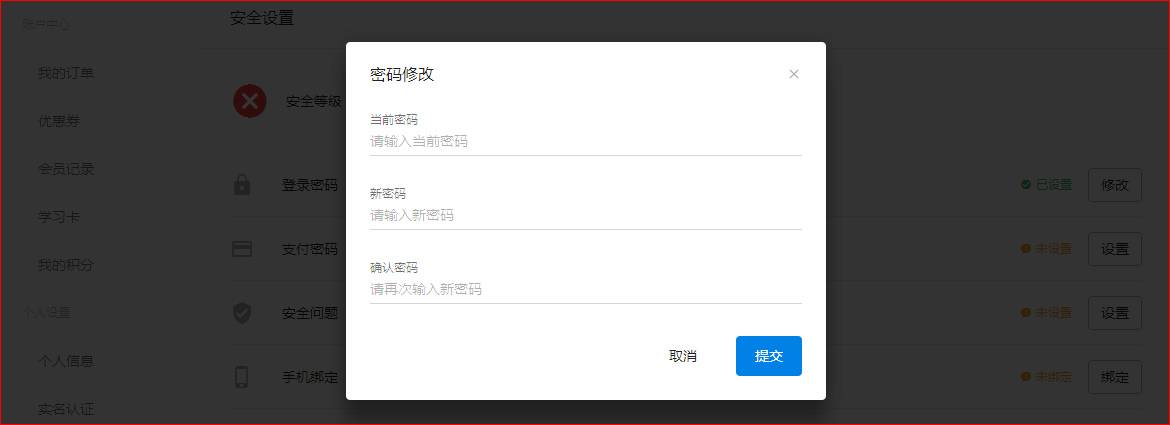 第三步:进入密码修改弹出框,输入当前密码、新密码、确认密码,点击提交,完成密码修改;